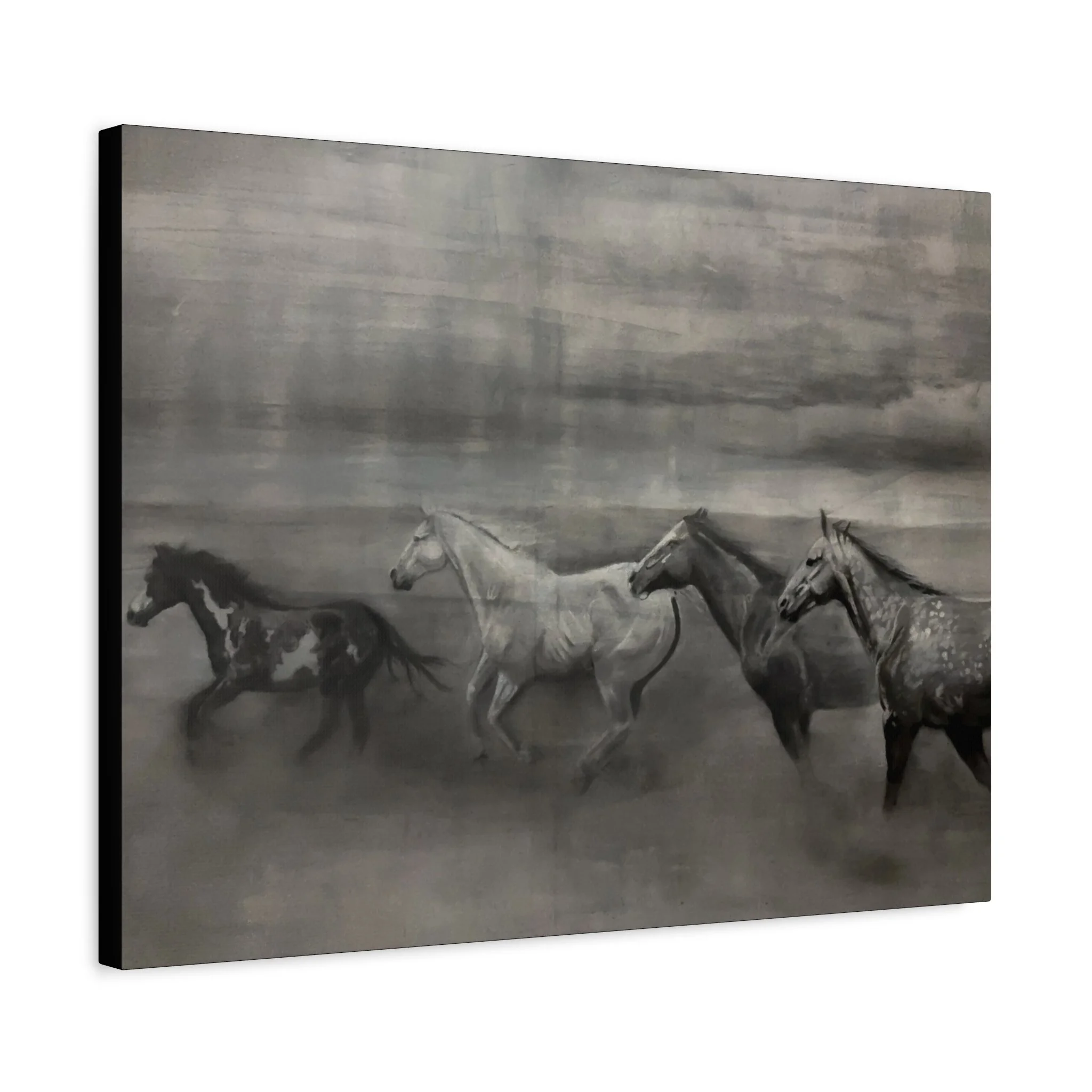 Rendered in deep charcoal tones, this piece leans into contrast and atmosphere, allowing light and motion to define the story rather than detail alone. The result is a cinematic moment suspended in time—both powerful and quiet.